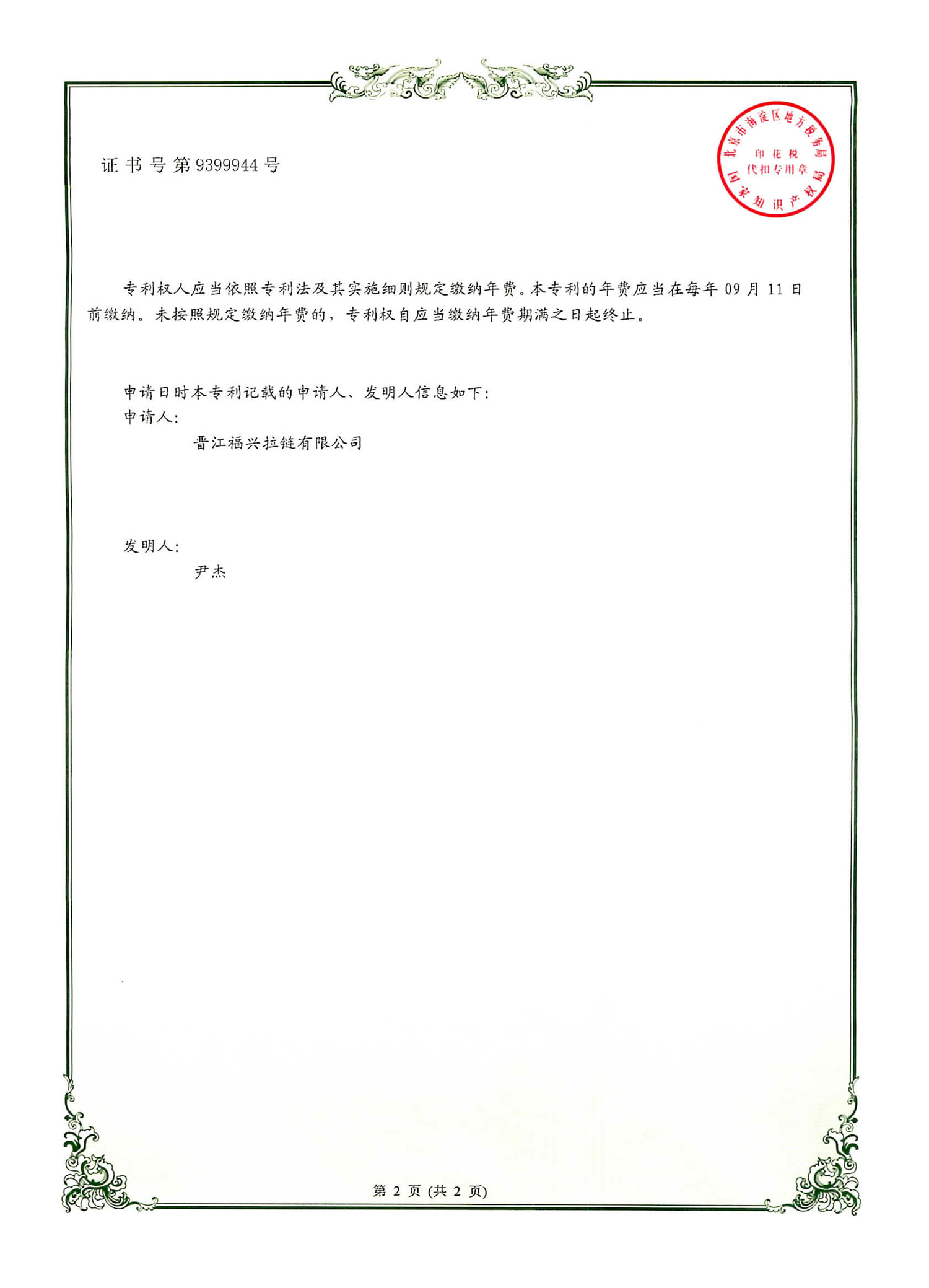 实用新型发明专利(第399944号)